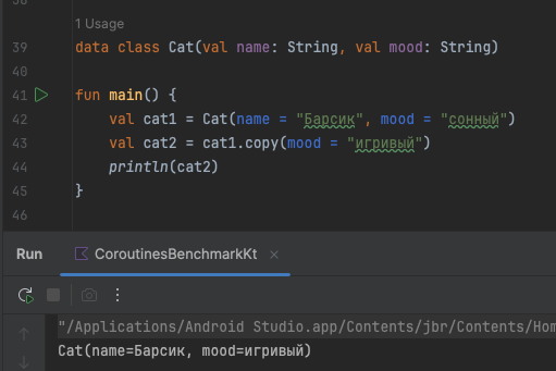 Когда мы создаём data class Cat(val name: String, val mood: String) kotlin автоматически добавляет в него метод copy(), который: Метод copy() для нашего котика выглядит примерно так: fun copy(name: String = this.name, mood: String = this.mood): Cat {
