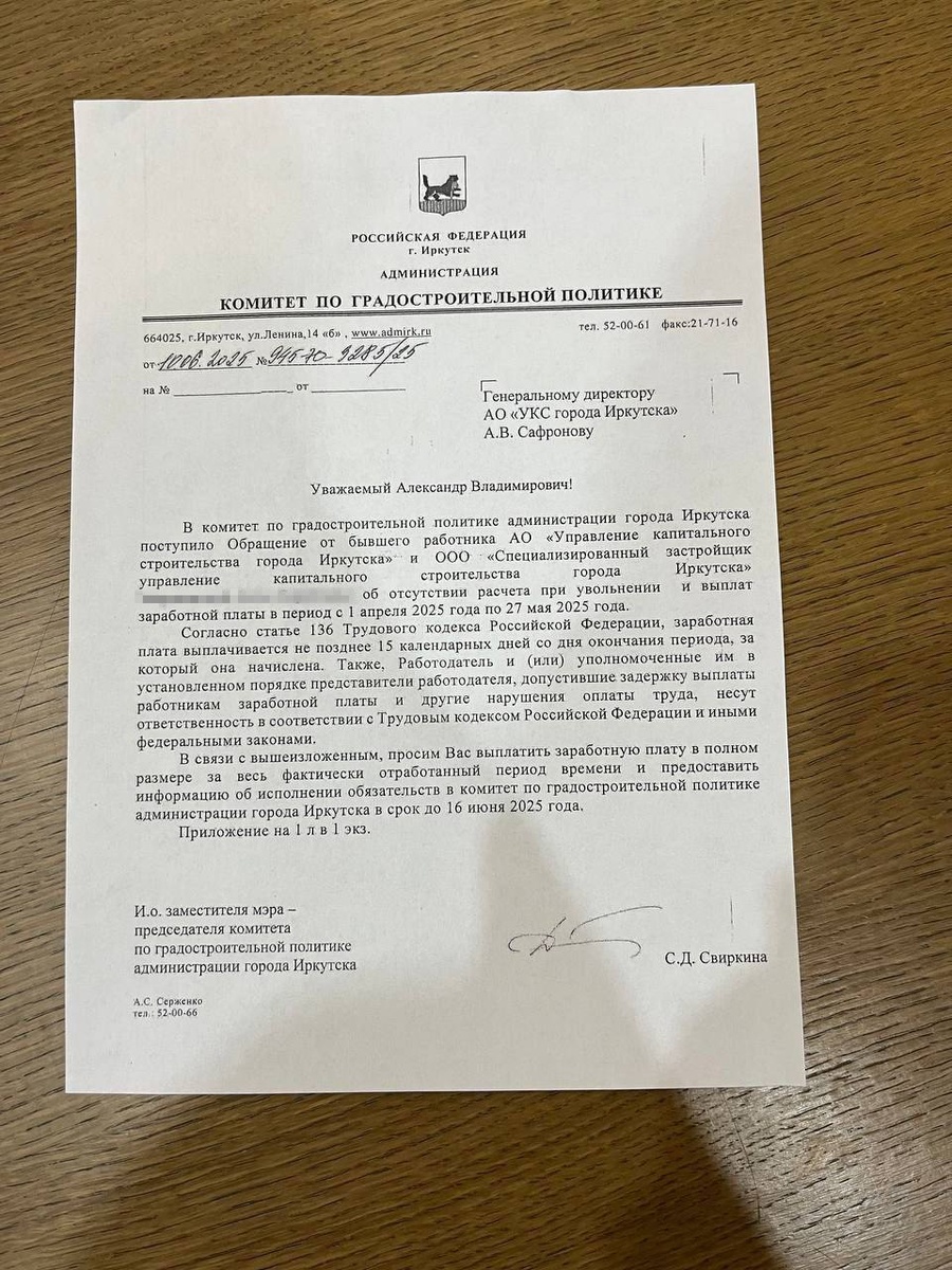 🏦 УКС Иркутска не платит зарплаты своим сотрудникам Вроде как нам говорили в руководстве УКСа, что землю стадиона «Пионер» и другие участки продали, чтобы достроить ЖК «Эволюция» и вывести предприятие из банкротства. Так вот, всё сделано, квартиры все проданы, как и участки, предназначавшиеся под спорт, на которых планируют строить многоэтажки, а сотрудники УКСа добиваются своих зарплат через суд. Цитата одного из сотрудников организации, который мне написал : «Хочу привлечь внимание общественности к произволу, который творится, как казалось бы в одной из главных контор администрации города - АО «УКС г. Иркутска» под руководством депутата Александра Владимировича Сафронова. Меня пригласили на работу в эту компанию в апреле 2025 года, спустя два месяца заработная плата мне не выплачивалась, что и стало одним из поводов моего увольнения. Расчет при увольнении мне также не был предоставлен. Мною была написана не одна жалоба в различные инспекции, в том числе мэру города Иркутска. От