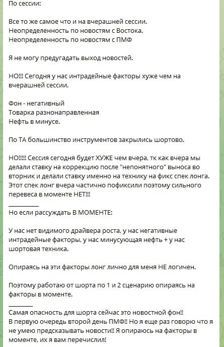 🆘В рамках обучения смотрим обзор. Это ежедневный обзор который выходит в закрытом ТГ канале ДО начала сессии. ❗️Тема: Почему в рамках интрадея я делаю ставку именно на факторы а не на ожидания. Именно поэтому мы сегодня в ШОРТЕ 1.План на сегодняшнюю сессию. ШОРТ + скрин с планом из закрытого ТГ канала. ____________ ❗️Как итог ММВБ медленно но верно сползает вниз. ____________ Ютуб👉https://youtu.be/NTi1aO9p4PE Рутуб👉https://rutube.ru/video/private/20b30e8a420cfdd9b4b544fb932b3da8/?p=0odHRglMq-llE47z7a_Lww __________ 🆘СМОТРИ ОБЗОРЫ!!! Хочешь ежедневно получать такую информацию до начала ОС?? Присоединяйся!!! ТГ канал @LaktionovPrivat_bot - Подписка отбивается за одну сделку!