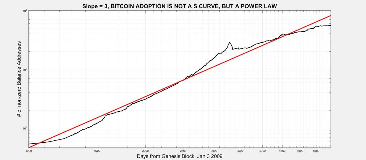 Bitcoin растёт не по S-кривой. А по степенному закону. Если коротко: это меняет всё. Обычно новые технологии проходят путь по S-кривой: долго не замечают → потом взрывной рост → затем насыщение. Но биткойн, как видно по графику адресов с ненулевым балансом, живёт по другим законам. Он не “взрывается” — он непрерывно и стабильно впитывает капитал уже больше 16 лет. Без рекламных кампаний. Без государственных программ. Без маркетинга. Что это значит? 1. Не будет точки “ускорения”, за которой все вдруг осознают. Осознание будет расползаться, как лёд весной — медленно, но неотвратимо. 2. Каждая ступень роста похожа на предыдущую. Масштаб не влияет на динамику. Это и есть свойство степенного закона — масштабируемость без изменений модели. 3. Биткойн не нуждается в мессии. Он не требует хайпа. Его не надо спасать. Он просто делает своё дело: сохраняет энергию, показывает доступ, строит сеть. День за днём. Если биткойн и дальше будет расти по степенному закону — он станет глобальным хр