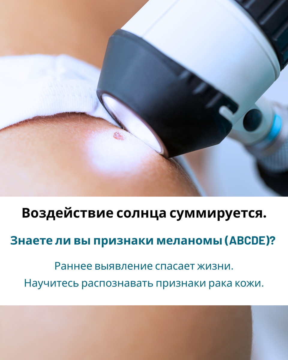 Рак кожи — это самый распространённый вид рака, и, к сожалению, многие из нас недооценивают его опасность. Хотя большинство форм рака кожи хорошо поддаются лечению при раннем выявлении, некоторые, как, например, меланома, могут быть смертельно опасными. Ваша кожа постоянно подвергается воздействию внешних факторов, особенно солнца, поэтому крайне важно знать, на что обращать внимание. Рак кожи — это аномальный, неконтролируемый рост клеток кожи. Чаще всего он развивается на участках тела, которые регулярно подвергаются воздействию ультрафиолетового излучения. Существует несколько основных типов рака кожи: Меланома часто выглядит как необычная родинка или изменение уже существующей. Запомните правило ABCDE, чтобы помочь себе определить потенциально опасные изменения: Регулярно осматривайте свою кожу. Проверяйте все родинки и пятна, включая те, что находятся на труднодоступных участках тела (спина, за ушами, на подошвах стоп) — попросите кого-то помочь вам. Если вы заметили какие-либо из