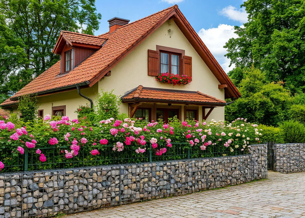 Пример: В коттеджном поселке "Зеленый мыс" габионы с высаженными у основания розами через 2 года превратились в живые изгороди.