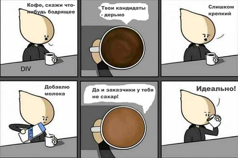 – HR-отдел: «Ну, мы разместили вакансии, списанные у коллег. Ждём откликов уже две недели, но все резюме о чём-то не о том. Не орите. Кадров на рынке нет. К тому же у вас в отделе такая текучка, что дизайнеры всё равно через месяц уволятся, а кадровый документооборот тоже на нас. Зачем нам эта головная боль, если проще валить кандидатов на собеседовании? А что процессы буксуют и приходится деньги клиентам возвращать – так зачем вы набрали столько проектов?». «И вообще, наша фирма в промзоне – людям это не нравится, меняйте офис на бизнесс-класс и квладывайте денег в продвижение HR-бренда компании».