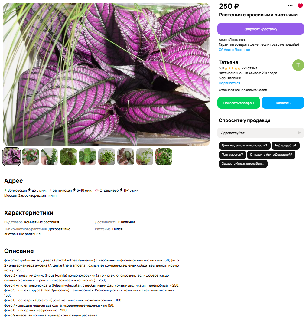 Пока я была в Москве, чтобы времени даром не терять, я смотрела на Авито объявления вокруг моей станции метро. Планов на пребывание, как обычно, было много, так что далеко ехать просто некогда. И вдруг встречаю я объявление совершенно необычное. Я даже таких растений не знаю, но прямо что-то очень интересное! Оказалось, что продавец от меня буквально через остановку автобусную и я решила прикупить на пробу эти необычные растения - Стробилантес Дайера и Альтернантера Амоена. Я вообще ничего не знаю ни о том, ни о другом))) Вижу обоих первый раз. Но они показались мне на столько интересными, что я таки решила, не смотря на день гуляний и усталость, ввечеру идти за этими цветами)))) И вот такая у меня образовалась парочка: Стробилантес Дайера хозяйка сказала, что более капризный и требовательный к свету. А Альтернантера Амоена простецкое растение, не требовательное. Ну поглядим так ли это))) Стробилантес Дайера очень впечатляет, я посмотрела на него взросленького. Красавчик! Судя по обили