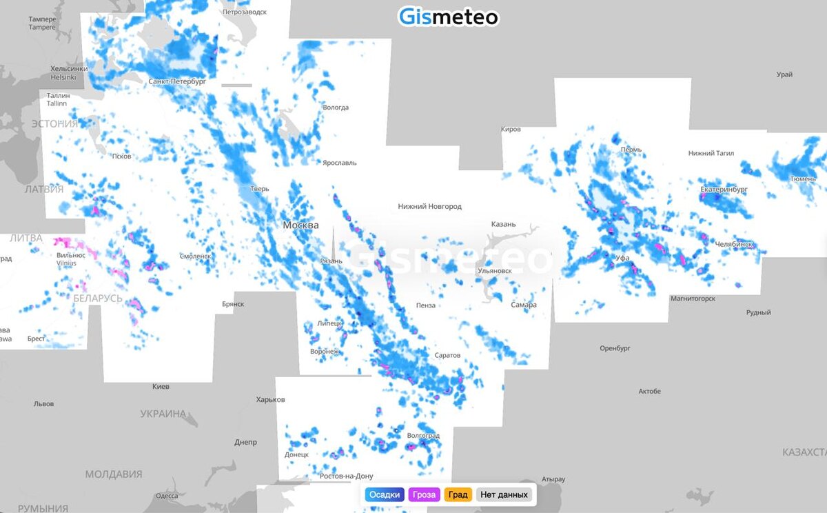 🌧️ В прогнозе — дождь Судя по радару Гисметео, осадки сейчас идут над огромной территорией западной части России. Местами фиксируются грозы и даже град (отмечены фиолетовым и жёлтым на карте). ⚡Перед выходом на улицу обязательно проверьте радар, чтобы случайно не оказаться в самом эпицентре грозы!