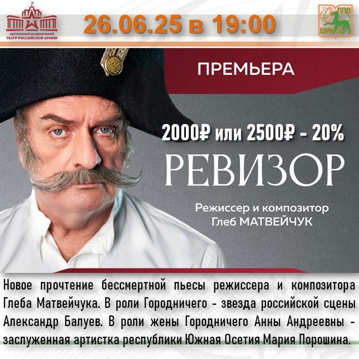 Уважаемые ШИКарные коллеги! ПРОФСОЮЗ СВАО ПРЕДЛАГАЕТ ‼6 билетов (на СВАО) на премьеру 📅 26 июня 🎭 Спектакль «Ревизор» 🏛 Театр Российской Армии 🤵♂️в главной роли Александр Балуев Постановка Матвейчука. 💰Стоимость: 2000₽ и 2500₽ 👛 Дотация 20% на каждый билет программе «От спорта к искусству» МГО Профсоюза образования Билеты электронные #Афиша #ОтСпортаКискусству
