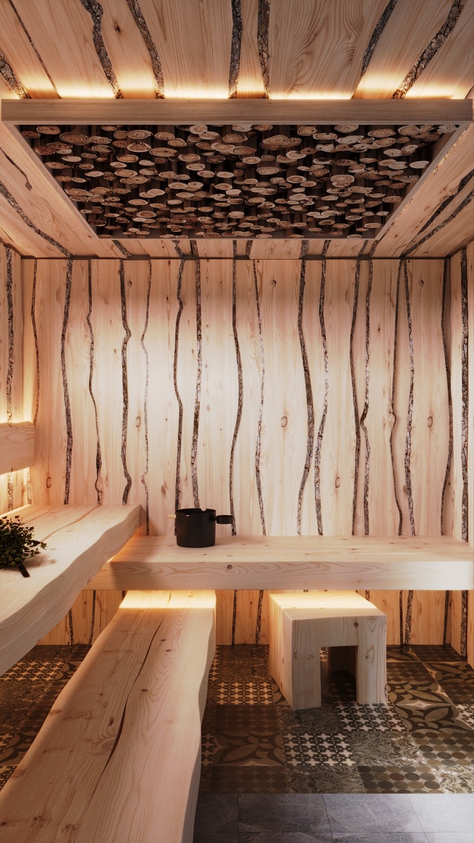 Хорошо оформленный интерьер бани может стать настоящим произведением искусства, а правильные детали помогут создать уникальную атмосферу. В этой статье мы поговорим об интерьере бани в стиле леший, а также представим несколько вдохновляющих фото. Стиль леший в интерьере бани подразумевает использование натуральных материалов и органичных форм, которые гармонично вписываются в окружающий ландшафт. Основными характеристиками этого стиля являются: Потолок в бане можно украсить панно из можжевельника. Этот материал не только прекрасно выглядит, но и обладает насыщенным ароматом. В случае необходимости панно можно дополнительно подсветить, добавив мягкое освещение, которое подчеркнет текстуру древесины и создаст уютную атмосферу. Отделка стен и других элементов бани натуральным деревом создаст ощущение природы внутри. Дерево не только экологично, но и обладает антисептическими свойствами, что особенно важно для банной атмосферы. Светлые древесные оттенки визуально увеличат пространство, тог