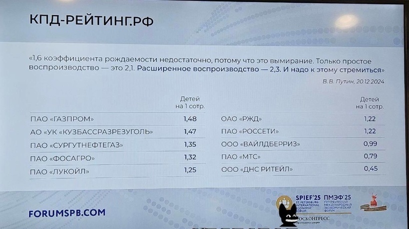 Сотрудники российских крупнейших корпораций вымирают. Коэффициент рождаемости у них — ниже предельной планки 1,6, установленных президентом РФ Владимиром Путиным. В топ-3 по корпоративной поддержке демографии (КПД) вошли: «1,6 коэффициента рождаемости недостаточно, потому что это вымирание. Только простое воспроизводство — это 2,1. Расширенное воспроизводство — это 2,3. И надо к этому стремиться», — говорил Путин в конце 2024 года. Он сказал, что в СССР коэффициент составлял 2 пункта, и предположил, что этой цифры удолось достичь «за счет тех республик, которые сегодня не входят в Российскую Федерацию». Главная новость по теме