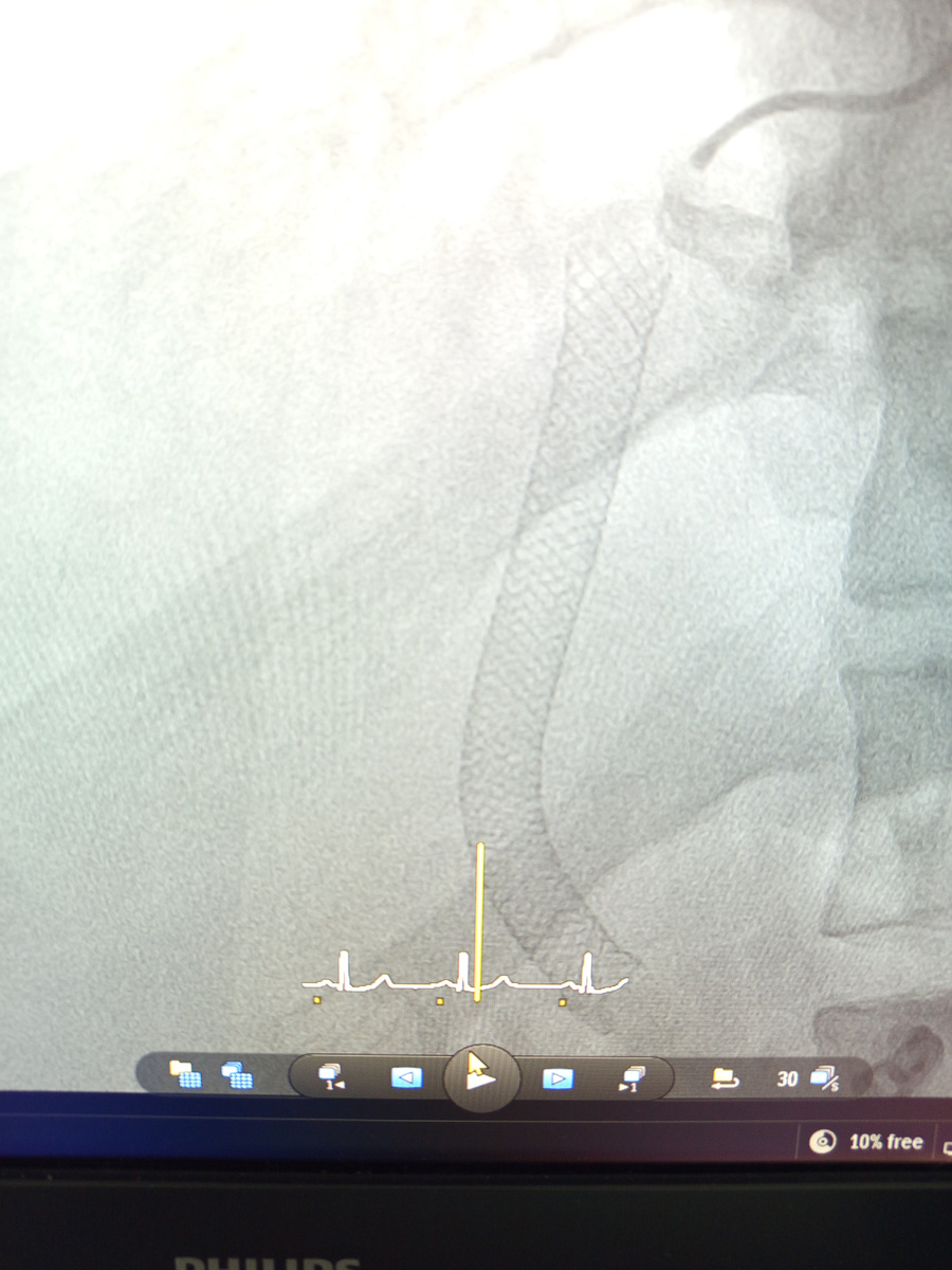 Завели проводник назад , сняли левый направляющий катетер , дала правый.