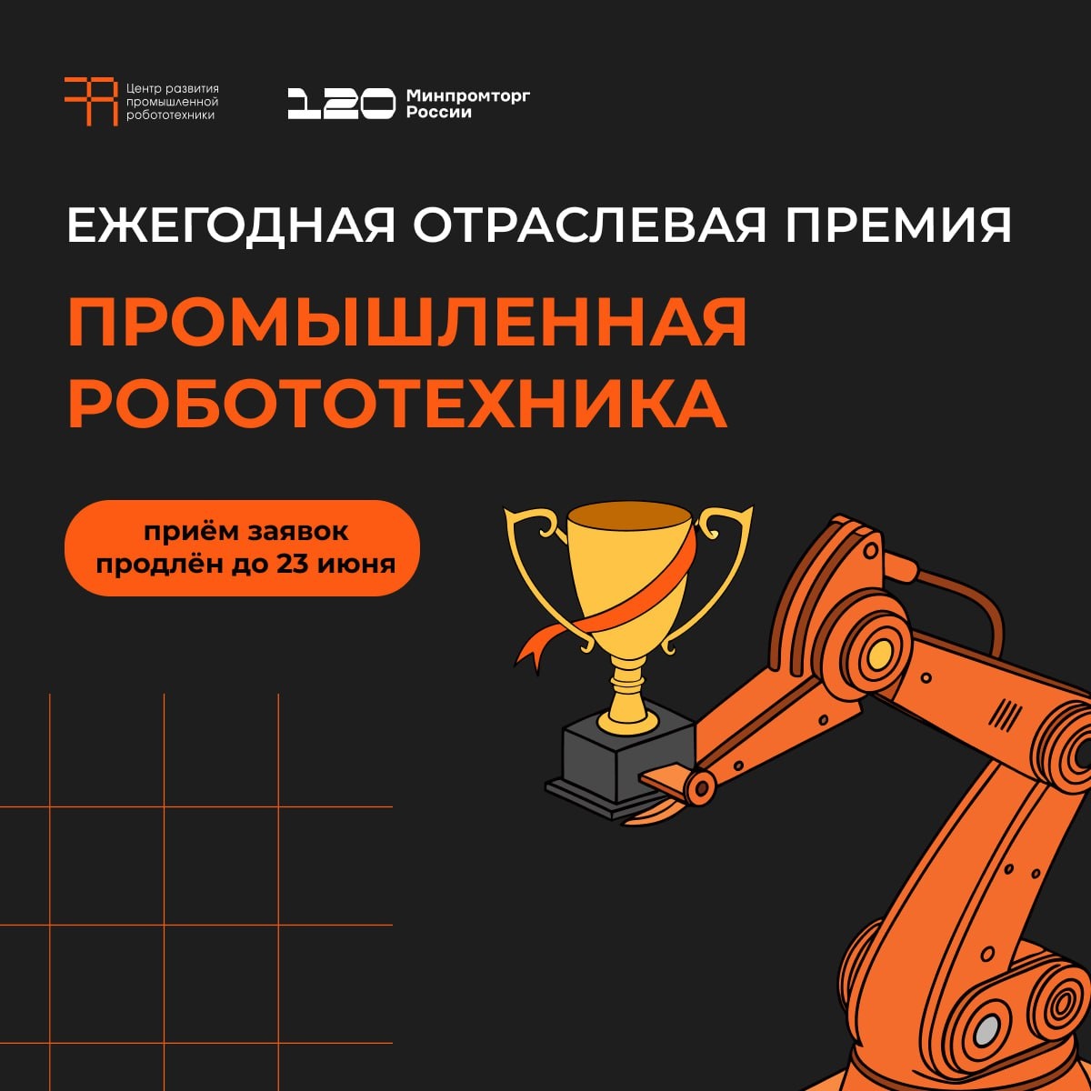 Продлили приём заявок на премию года «Промышленная робототехника» Премия вручается за выдающиеся достижения в сфере промышленной робототехники — от передовых разработок до внедрения инновационных роботизированных систем. Кто может принять участие: 🔡производители и интеграторы робототехнических решений; 🔡регионы, активно внедряющие автоматизацию; 🔡научные и образовательные организации; 🔡учёные, инженеры, студенты и другие физические лица, активно работающие в сфере инноваций; 🔡отраслевые СМИ и популяризаторы технологий. Номинации: 🔡территория роботизации — лучший регион для развития отрасли; 🔡образовательный прорыв — передовые программы подготовки кадров; 🔡просветитель года — эффективные инициативы по популяризации отрасли; 🔡лидер внедрения — максимальный рост автоматизации производства; 🔡инновация года — технологический прорыв в робототехнике; 🔡интегратор года — лучшие практики внедрения промышленных решений. Церемония награждения пройдёт 9 июля в рамках Международной
