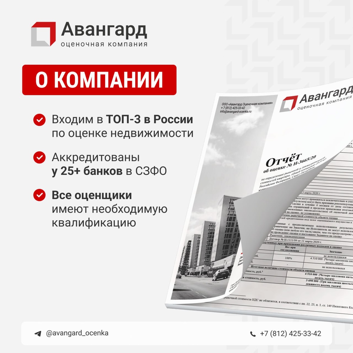 Авангард Оценочная компания 🔸 оказывает полный спектр услуг по оценке рыночной стоимости имущества и проведению строительных экспертиз. С момента основания в 2017 году наша компания выполнила более 120 000 отчетов об оценке, став одним из ключевых аккредитованных партнеров для свыше 25 крупнейших банков Северо-Западного региона: Металлинсвестбанк, Россельхозбанк, Абсолют Банк, Сбербанк (в т.ч. по системе ДомКлик), Газпромбанк, Банк АкБарс, Промсвязьбанк, Банк Уралсиб, Банк Санкт-Петербург, Совкомбанк, Банк Россия, Московский кредитный банк, ДОМ РФ, Альфа Банк, Новиком Банк, Примсоцбанк, Уральский банк реконструкции и развития, Росбанк и некоторые другие. По результатам независимого исследования рейтинговой компании РАЭКС-Аналитика за 2023 год Авангард Оценочная компания подтверждает свои позиции на рынке оценочных услуг: 1. 3 место в рейтинге крупнейших оценочных компаний России по оценке недвижимого имущества. 2. 7 место в рейтинге оценочных организаций Северо-Западного федеральн