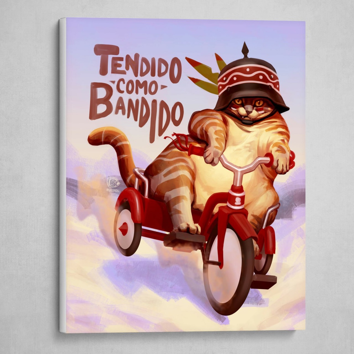 «Бандит на Расслабоне» Толстый полосатый кот мчит на трёхколёсном велосипеде, как будто за ним гонится весь мир или он сам только что его ограбил. Его взгляд — смесь вызова, хитрости и абсолютного самодовольства. На голове шлем с индейскими перьями, словно знак воина, выбравшего путь свободы, анархии и удовольствия. Надпись «Tendido como bandido» усиливает чувство дерзкого расслабления — когда ты бандит, но при этом абсолютно расслаблен. 😼🚴♂️💨 Это не просто забавный кот — это символ внутренней наглости, духа приключения и любви к себе без компромиссов. Такой «разбойник» живёт в каждом, кто не боится быть собой и ехать по жизни на своих условиях. Стили: Цифровая иллюстрация, поп-арт, юмористическая живопись, сюрреализм, современное наивное искусство. Автор работы: Коэнду МC, Халапа, Мексика 🇲🇽 🤍 47ART — подписаться #арт #картина #искусство #современноеискусство #картинавинтерьер #интерьернаякартина #декор #декордлядома #декордома #декоринтерьера #интерьер #цифроваяживопись