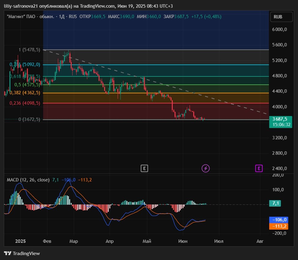 $MGNT 📉 Текущая ситуация: Краткосрочный тренд – нисходящий. Ключевой уровень поддержки – 3680. Пока нет четкой фигуры (паттерна) для определения дальнейшего движения. 🔽 🔽 Негативный сценарий: Если цена не удержит 3680, возможен спад до следующей значимой зоны – ~3143. 🔼 🔼 Позитивный сценарий: При пробое сопротивления 4065 возможен рост к 4386. Что важно? Сейчас рынок в неопределенности, и важно следить за реакцией цены на 3680. Пробой вниз или отскок вверх зададут направление. Я бы не стала пока входить в сделку. НЕ ИИР Торгуйте осторожно! 🚨 $MGNT#теханализ #трейдер #инвестиции #магнит