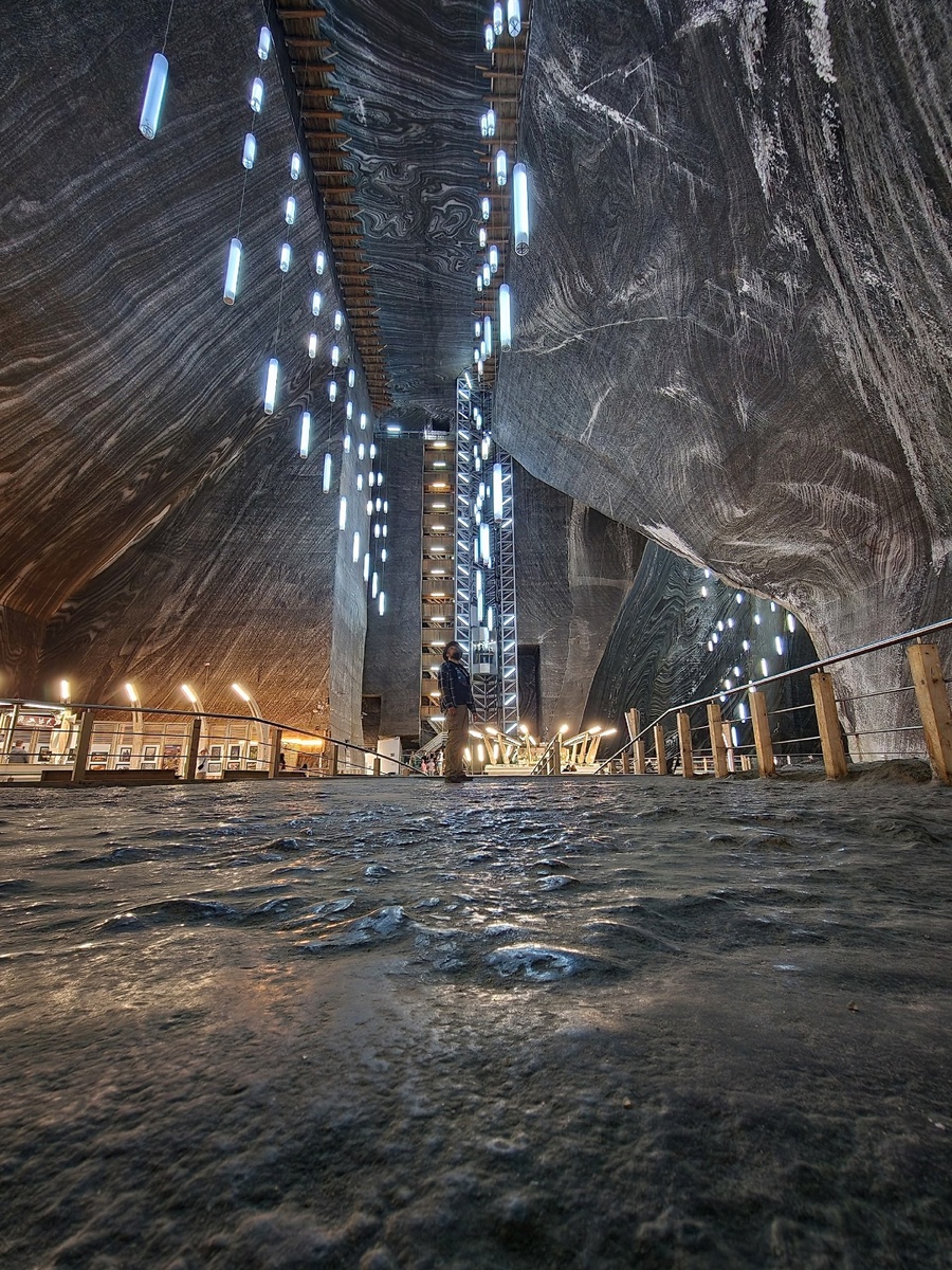Было ощущение, что я оказался где-то на другой планете. Вот прям буквально, без преувеличений! На нашей я ничего подобного не встречал! Таинственный полумрак, освежающая прохлада (хотя на поверхности в это время было +30), сюрреалистическая подсветка, запах соли, непонятные звуки. Бесконечные тоннели, галереи и шахты... Ещё во времена Римской империи здесь, в далёкой провинции Дакия, начали добывать соль. И с некоторыми перерывами продолжали аж до 1932 года! Потом всё забросили. А в 1992 году открыли снова. Но уже как оздоровительный курорт. Типа полезно солью дышать. Большая соляная пещера с историей! И в итоге развернулись по-полной! Устроили тут целый парк развлечений. Но непростой! С колесом обозрения (единственным в мире подземным), полем для гольфа, подземным озером с лодками, панорамными лифтами и многими другими штуками. Есть тут и музейная экспозиция со множеством артефактов времён соледобычи. Вот, например, аутентичный подъёмник для соли, который до сих пор установлен на сво