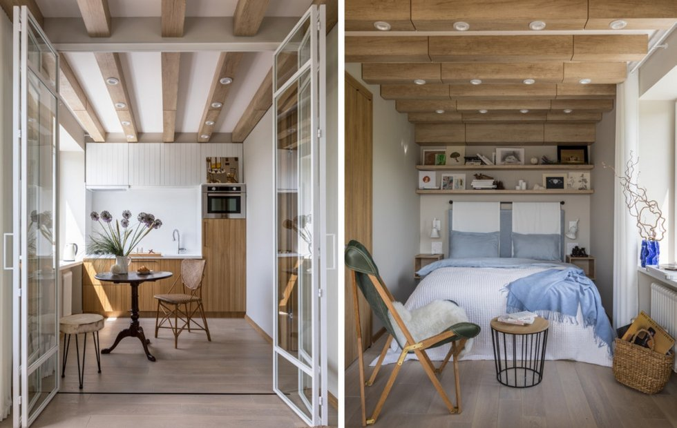 Стильная однушка для студентки в Хамовниках Место: Хамовники Метраж: 33 кв. м Комнаты: 1 Cанузлы: 1 Дизайн: Анастасия Рыкова Фото: михаил степанов Чтобы превратить «убитую» квартиру в старом доме в комфортное и функциональное жилье, потребовались демонтаж всех старых покрытий и небольшая перепланировка. Теперь владельцев здесь радует не только вид за окном, но и уютная обстановка внутри. Эту однушку в Хамовниках декоратор Анастасия Рыкова из дизайн-бюро Special Style купила для своей дочери-студентки. Из окон открывается шикарный вид на Новодевичий монастырь, поэтому ни маленькая площадь, ни старый дом не смутили новых владельцев. Квартира досталась в «убитом» состоянии, поэтому ее полностью вычистили, поменяли окна и батареи. Не обошлось и без перепланировки: проход в жилую комнату сделали через кухню, а для зонирования использовали прозрачную дверь-перегородку от компании Makeloft. Потолок опускать не стали, но украсили его деревянными балками, в которые встроили светильники. Единств
