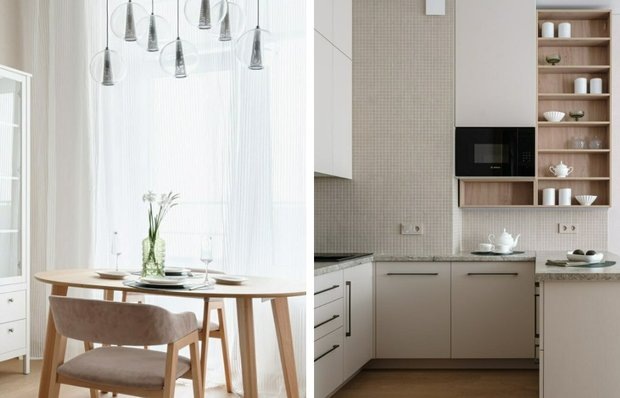 Порция вдохновения уже ждет вас Эта квартира в Москве площадью 63,2 м² проектировалась специально для родителей: они переезжали из частного дома в городскую среду, и важно было сохранить ощущение уюта, свободы и связи с природой. Над проектом работали дизайнеры Надежда Шишкова и Лидия Судиловская: они стремились сделать интерьер современным и практичным, но при этом теплым, комфортным и близким по духу. Одной из ключевых зон в квартире стала кухня-гостиная — мама заказчика обожает готовить, поэтому все решения здесь продумывались особенно тщательно. Планировку не меняли: кухня заняла место вдоль одной стены и частично перешла в остров, за которым удобно заниматься приготовлением. Гарнитур выполнен в светлой гамме с теплой фактурой дерева на открытых полках — именно они делают кухню более «домашней» и визуально легкой. Техника встроена: посудомоечная машина, варочная панель, духовка, микроволновка. Холодильник — отдельностоящий, его разместили в глубине композиции. Система хранения прод