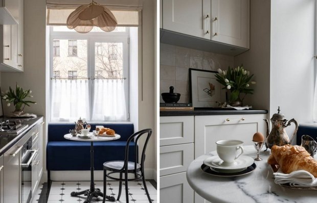 Решения, которые легко повторить и в вашем интерьере Квартира расположена в доме, построенном в 1937 году. Дизайнеры из студии Buro Polki разработали интерьер для молодой девушки, увлеченной старым московским стилем и винтажной мебелью. Они черпали вдохновение из атмосферы улицы, на которой находится квартира, а также из французских интерьеров, где кухни обычно играют второстепенную роль. Поэтому она получилась небольшой, но очень функциональной. Стены в кухне окрашены в светлый цвет, на потолке установлены лепные карнизы, а на полу уложена метлахская плитка. Эти элементы интерьера практичны и рассказывают свою историю, добавляя особый шарм и тепло в обстановку. Кухня осталась на прежнем месте, газовую плиту сохранили. Линейный светлый гарнитур был изготовлен на заказ, что позволило эффективно использовать каждый квадратный метр площади. Кухня оснащена достаточным количеством мест для хранения и всей необходимой современной техникой — это делает ее не только функциональной, но и удобно