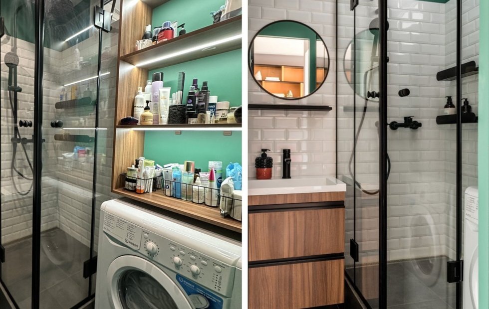 Главное изменение в ванной комнате — замена традиционной ванны на душевую кабину. Это решение позволило значительно расширить функциональность небольшого пространства.