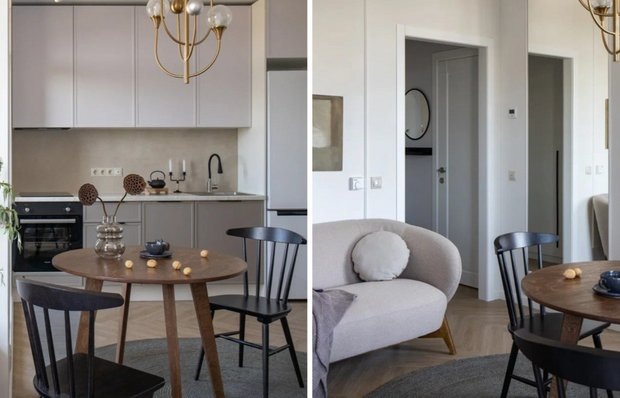 Ценные советы по обустройству маленькой квартиры — берите на заметку! Обустроить небольшую квартиру — задача не из легких. Однако, с правильным подходом и продуманными решениями, можно создать пространство, которое будет не только функциональным, но и уютным. Рассмотрим простые, но эффективные приемы, которые применила дизайнер Елена Сизова в студии площадью всего 32 кв. м. Все стены окрашены в светлый оттенок — он гармонично соединяет все зоны квартиры и визуально увеличивает ее размер. Балконную дверь оставили без текстиля, чтобы обеспечить максимальный приток естественного света. Это добавляет ощущение простора и легкости в помещении. Не менее важный элемент — напольное покрытие. В основном помещении уложен кварцвинил «елочкой». Диагональный рисунок расширяет пространство, придает интерьеру динамику и визуально увеличивает площадь. Кухня играет важную роль в каждой квартире, и в малогабаритной она должна быть максимально функциональной. В проекте кухня оформлена с плавным переход