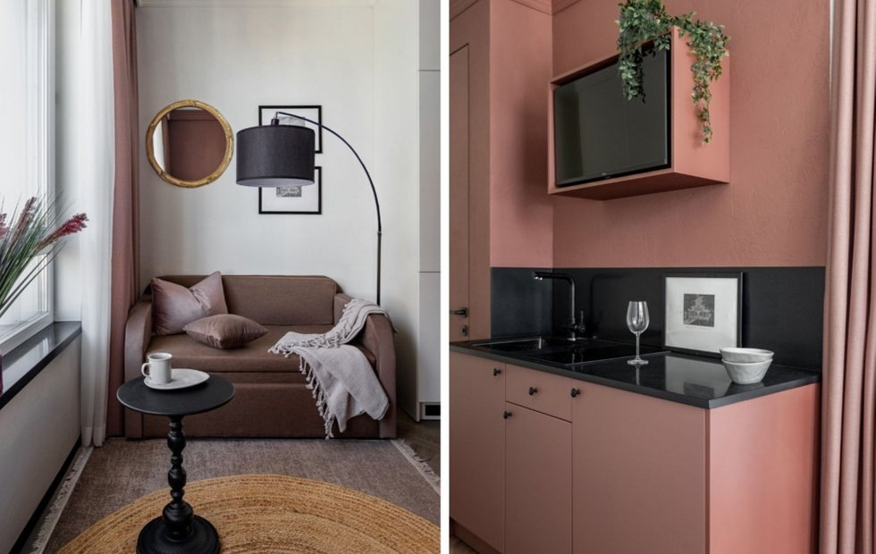 Спланировали кухню, спальню, гостиную и даже гардероб Место: Москва Тип дома: Новостройка Метраж: 18 кв. м Комнаты: 1 Cанузлы: 1 Дизайн: Сара Михайлова Студия расположена в новостройке Москвы, в районе Измайлово. Хозяева квартиры, проживающие в Иркутске, приобрели жилье удаленно, доверив разработку проекта и его реализацию дизайнеру Саре Михайловой. Главной задачей было учесть все необходимые аспекты для комфортного проживания студента. Квартира изначально имела планировку от застройщика, с заявленными «маяками», что требовало соблюдения зон проектирования мокрых точек. На 18 кв. м удалось разместить спальню, зону для отдыха с дополнительным спальным местом, кухню и достаточно просторные места для хранения. Чтобы обстановка больше напоминала домашнюю атмосферу, в интерьере были использованы теплые, обволакивающие цвета и уютные мягкие фактуры. Кухня компактна и проходная, но в ней есть все необходимое для удобного приготовления пищи. Фасады выполнены в цвет стен, в то время как черные