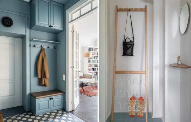 Ценные советы по обустройству компактной прихожей — берите на заметку! Современные прихожие могут представлять собой вызов для организации хранения: ограниченное пространство требует креативного подхода и умения максимально эффективно использовать каждый квадратный метр. Собрали 7 классных идей для хранения из проектов наших дизайнеров, которые помогут создать функциональное и стильное пространство в вашей небольшой прихожей. Настенные вешалки и крючки — идеальный способ освободить пол. Они подойдут для хранения повседневной верхней одежды, шарфов, сумок, зонтов и аксессуаров. Вы можете выбрать красивые модели, которые станут акцентом в интерьере, или лаконичные изделия, гармонично дополняющие общий стиль вашей прихожей. Выбирайте мебель, которая выполняет несколько функций. Например, скамейки и пуфы с внутренним хранилищем или тумбы с полками помогут организовать пространство и обеспечить удобное место для сидения при обувании. Если позволяет место, создайте встраиваемый шкаф. Это отл