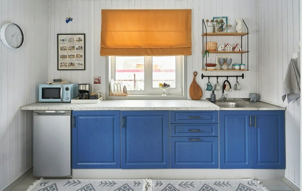- Кухонные фасады выполнены в ярко-голубом цвете;