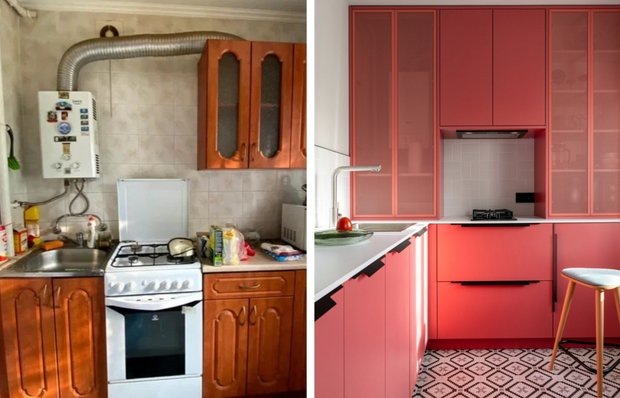 Порция вдохновения и красивых дизайн-решений Эту потрясающую кухню оформила дизайнер Полина Чернышова. Требовалось создать интерьер, который бы вызывал эмоции и не оставлял равнодушным. Ставку сделали на яркие оттенки и качественную отделку, благодаря чему кухня выглядит небанально, стильно и современно. До переделки эта кухня выглядела довольно уныло. Темные бои с активным принтом давно устарели, коричневый гарнитур казался скучным и неактуальным. Все коммуникации и газовая колонка были на виду, что только добавляло ощущение беспорядка и дискомфорта. Дизайнер оставила кухню на своем месте, но перенесла вход со стороны гостиной. Между гостиной и кухней предусмотрели двери кассетного типа, что является важным аспектом для перепланировки, особенно в помещениях с газом. Рифленое стекло на дверцах повторяет ритм панелей на стенах и придиванного столика в гостиной, создавая целостный визуальный эффект. Стены оформлены светлой краской, что помогает визуально расширить пространство. Напольная