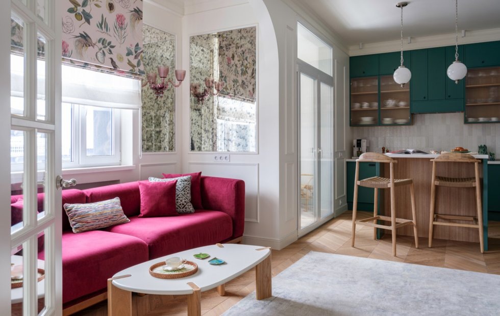 Головы птиц, обои с улитками, красный потолок и люстра в ванной — в интерьере переплетаются утонченный французский стиль и эклектичные детали Место: Москва Тип дома: Новостройка Метраж: 62 кв. м Год реализации: 2022 Комнаты: 2 Cанузлы: 2 Высота потолков: 3 м Дизайн: Катя Чистова Стилист: Натали Герц Фото: Натали Герц Дизайнер Катя Чистова создала интерьер двухкомнатной квартиры во французском стиле, добавив яркие акценты и растительные мотивы. Заказчица — молодая, активная девушка, вдохновляющаяся путешествиями по всему миру, от Монголии до Мадагаскара. Она хрупкая, но любит экстрим. Элементы эклектики добавляют оригинальности, отражая индивидуальность заказчицы и ее страсть к приключениям. Планировку обсуждали долго — заказчица колебалась между более рентабельным вариантом и тем, который приносил бы ей удовольствие. В итоге она выбрала себя! В результате в квартире появилась красивая двустворчатая дверь с расстекловкой, ведущая из гостиной в мастер-спальню, а также проходная гардеробн