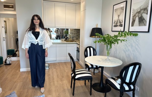 Стильный интерьер с зеркалом вместо фартука, антиквариатом и светом без проводов Возможно ли в типовой малогабаритке в новостройке обустроить интерьер во французском стиле без лепнины и камина? Узнайте в нашем новом румтуре! Герой румтура: дизайнер-декоратор Екатерина Гагуа обустроила квартиру для своей подруги. Кратко о квартире: эта типовая евродвушка находится в новостройке на Очаковском шоссе. На начало проекта в квартире была отделка от застройщика. Главной задачей было обустроить стильный интерьер с элементами французского шика, без перепланировки и без масштабных ремонтных и строительных работ. В квартире есть прихожая, кухня-гостиная, отдельная спальня и совмещенный санузел. Посмотрите, каким стильным и уютным получился интерьер. Отделку от застройщика оставили, а французского настроения добились с помощью декоративных элементов и мебели. Кухня тоже получилась с парижским шиком — маленькая, но очень красивая и функциональная. Каждый элемент продуман таким образом, чтобы сочетат