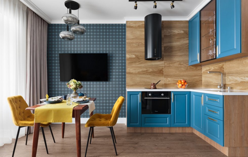 Благодаря комбинации современного и английского стиля получился удобный и эргономичный интерьер Место: Краснодар Тип дома: Новостройка Метраж: 42 кв. м Год реализации: 2024 Комнаты: 2 Cанузлы: 1 Высота потолков: 2,7 м Бюджет: 1,5 млн рублей Дизайн: Лилия Горожеева Стилист: Лилия Горожеева Фото: Сергей Денисенко Владелец квартиры — молодой журналист и студент. Перед дизайнером Лилией Горожеевой он поставил задачу обустроить эргономичный открытый интерьер в обволакивающих темных оттенках синего. Лилия создала открытую планировку, в то же время заботясь о наличии закрытых приватных уголков. Это позволило эффективно разграничить пространство в соответствии с функциональными потребностями и повседневной жизнью заказчика. Основная зона — это кухня-гостиная, где спальное место хозяина отделено стеклянной перегородкой. Телевизор удалось расположить так, чтобы его было удобно смотреть с разных точек квартиры. Одним из сложных моментов стало вытянутое и узкое пространство санузла, что потребовал