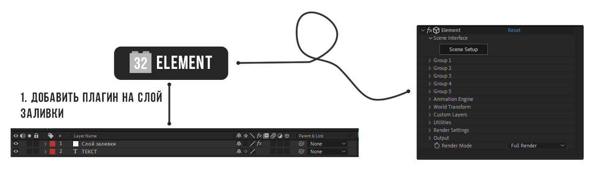Сам плагин даёт возможность добавлять, анимировать и текстурировать 3Д объекты прямо в After Effects. Но у многих возникают трудности с анимацией текста (честно говоря, сделано не интуитивно понятно). Я помогу разобраться с данной задачей. 1. Создаем текстовый слой и слой заливки, на который добавим плагин. 2. Раскрывает в плагине Custom Layers - Custom Text and Masks. В Path Layer 1 выбираем наш текстовый слой. 3. Заходим в Scene Setup Нажимаем Extrude и текст появится сам собой. Далее накидываем любой материал (в этом уроке разбирать материалы, как с ними работать и так далее мы не будем, только анимация). Перетаскиваем материал на текст. Далее дублируем наш слой с текстом. Меняем группу у дублированного слоя. Теперь нужно поменять вид отображения, чтобы начать взаимодействовать с каждой буквой отдельно. В слое второй группы начинаем крутить, перемещать и уменьшать буквы по вашему желанию (в примере я сдвинул их в центр, но полностью размер не уменьшал, в реальном проекте я рекоменду
