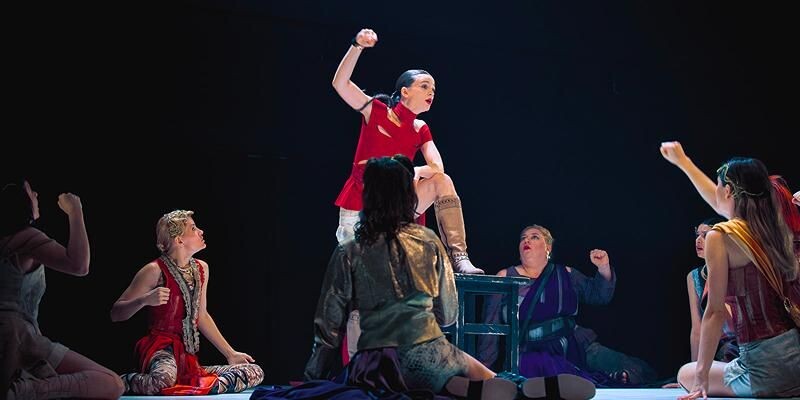 Далее комедия разыгрывается как по нотам: в одном углу ринга — группа разъяренных и одновременно растерянных мужчин в военной форме с налетом греческого киберпанка, в другом — роскошные барышни, упрямо настроенные удержать Акрополь любой ценой. Их эклектичные одеяния тоже отсылают к известным антиутопиям, красноречиво намекая на истинную вневременность происходящего. Мужское и женское сталкиваются как огонь и вода, и эта битва стихий сотрясает прямоугольное пространство сцены, поддерживаемое античными колоннами. Действие, впрочем, указанными рамками не ограничивается, смело переходя на верхние ярусы зала, уводя героев на боковые скамейки запасных и побуждая их к взаимодействию с публикой: у зрителя в любой момент могут узнать о самочувствии и попросить стакан воды для страждущих. Так режиссер, по своему обыкновению, избавляется от четвертой стены в театре, и этот прием работает безотказно, еще больше вовлекая зрителя в происходящее.