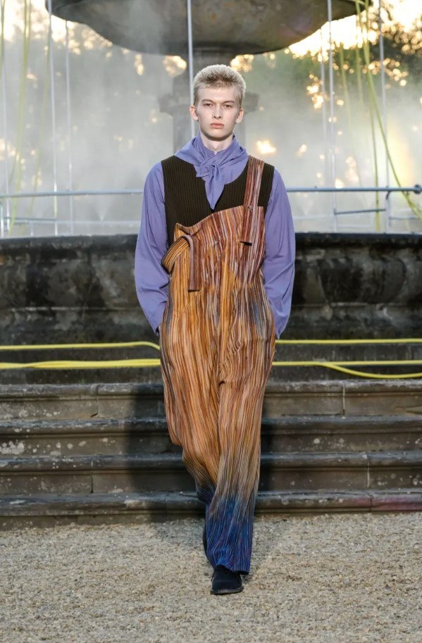 Issey Miyake представили мужскую коллекцию сезона весна 2026 в рамках выставки Pitti Uomo во Флоренции. Показ прошел в садах Виллы Медичи Ла Петрайя. Коллекция получилась уже в привычных для бренда плиссированных силуэтах. В нее вошли удлиненные жакеты, деконструированные накидки, пижамные комплекты, комбинезоны в полоску с градиентом и полупрозрачные блузки из органзы. В финале показа представили трансформируемую верхнюю одежду с вшитыми в капюшон вешалками (по задумке ее можно сложить в сумку-пыльник). Среди ярких деталей — маски и головные уборы в абстрактных формах и декор в виде кисточек для рисования. Коллекция выполнена в приглушенных пастельных оттенках: мятном, персиковом, оливковом, сиреневом и терракотовом.