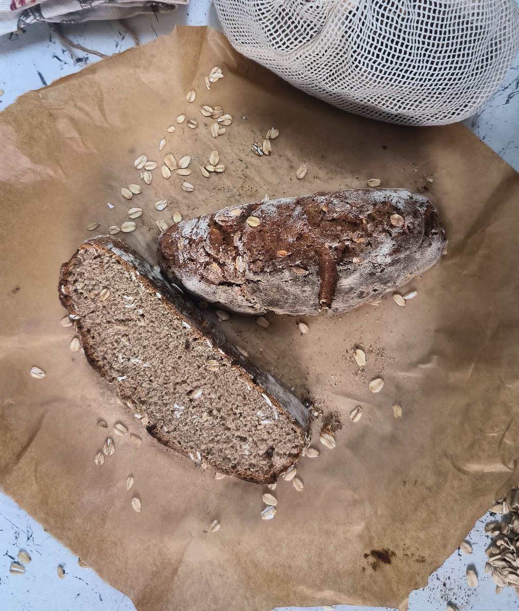 Ну что мои дорогие, я наконец-то нашла время для этого простого рецепта хлеба. Давно собиралась его приготовить. Рецепт из книги «5 ингредиентов» показался мне простым и быстрым. Всего пять продуктов - и на столе ароматный хлеб. Что может быть лучше? К тому же, он готовится быстро... Я взяла список продуктов и начала готовить. Правда, оказалось, что в рецепте есть ещё два ингредиента, но о них Джейми рассказывает уже в процессе приготовления. Ох... Он шутник... Джейми, не стоит так. В итоге получилось семь ингредиентов, а не пять. Ингредиенты: 260 г - цельнозерновая мука 100 г - ржаная мука 50 г - овсянка 300 г - йогурт 1 шт. - яйцо 10 г - соль 5 г - сода Приготовление: Возьмите две миски, большую для сухих ингредиентов и маленькую для жидких. В большой миске тщательно перемешайте оба вида муки, овсянку, соль и соду. В отдельной меньшей миске взбейте йогурт и яйцо вилкой до полной однородности. Следите, чтобы не осталось белковых или желтковых "прожилок", масса должна быть полностью од