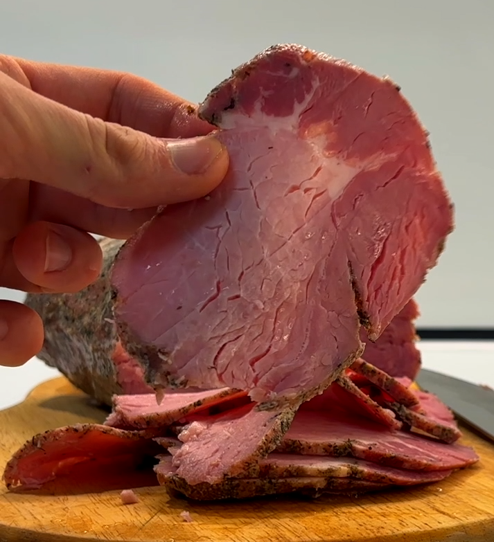 Карбонад самый настоящий, как из магазина! Только дома, вкуснее и полезнее, так как вы сами контролируете состав и процесс приготовления. 🔪Берём свиную корейку. Очищаем от жил, жирочка и пленочек. Если попался кусок с костями, их также аккуратно снимаем. Взвешиваем мясо. Понадобятся специи в расчете на 1кг мяса: - 2гр сушеный чеснок; - 2гр кориандр; - 2гр перец чёрный молотый; - 2гр мускатных орех; - 2гр орегано; - 10гр соль; - 10гр нитритная соль. ❗️Перечень специй можете варьировать по вкусу и по наличию. Однако, для получения красивого розового цвета ветчины, вам необходима нитритная соль - этот пункт обязателен. Смешиваем специи и обсыпаем мясо со всех сторон. Возможно, специй будет чуть больше, ничего страшного - что налипло, то налипло. Вакуумируем либо плотно обматываем в пищевую пленку и откладываем в холодильник на 5 дней. 😌 🥘Включаем су-вид на 74°С на 3 часа. 🧤Если у вас нет су-вида, можно приготовить в духовке, при вы этом вы должны быть уверены, что ваш духовой шкаф к