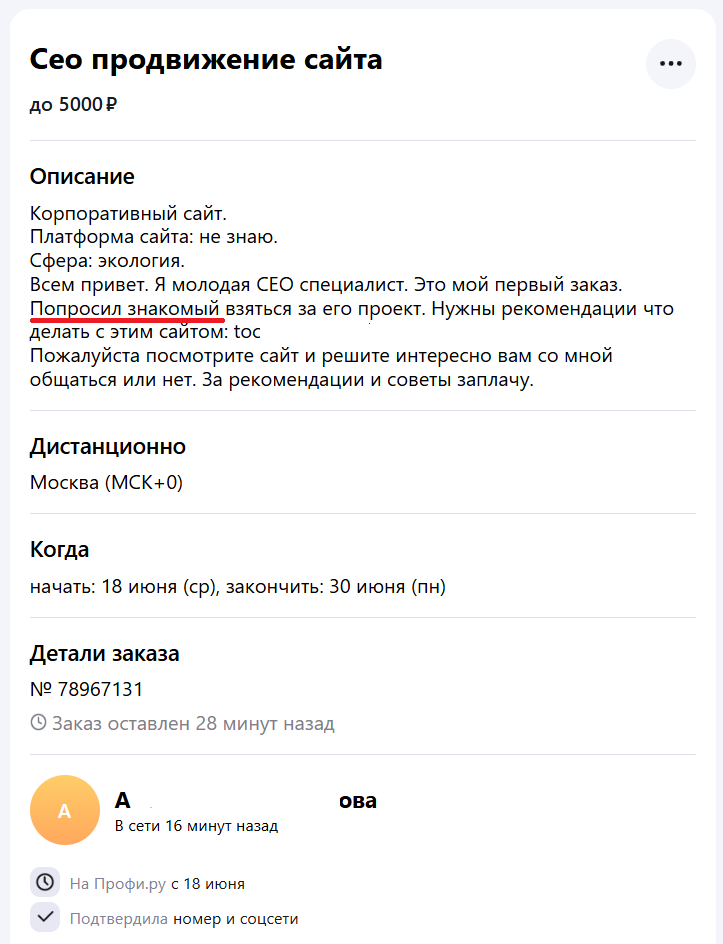 Как же у нас любят работать со знакомыми...А мне их консультировать😁 Повеселил момент с одним старым заказом, который болтался в обсуждении на Профи. Я откликнулся на 2 заявки этого клиента, кратко расписал объем работ. Мой профиль на портале с рейтингом 4.97 , более 60 отзывов. Заказчик прочитал заявку, и не ответил. Хотя мы даже не перешли к обсуждению цен. Сегодня же приходит заявка от девушки (см. скриншот), которая зарегистрировалась 18 июня на Профи. Пишет о себе "Я молодая СЕО специалист. Это мой первый заказ" 😂. 🔸Тут есть над чем посмеяться: - написано название другой специализации CEO (Chief Executive Officer) - это исполнительный директор компании - первый заказ, и уже считает себя специалистом. Адекватно было бы писать это хотя бы после первых позитивных результатов. Просит "посмотрите сайт, и напишите интересно общаться со мной, или нет". No comments 😂! 1. Заказчик выбрал знакомую без опыта 🤷♂️ для работы над проектом. 2. Мой отклик проигнорировал - вероятно, из-за то