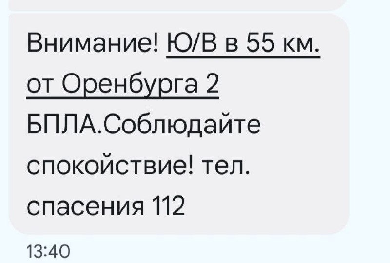 ⚡️Пришло СМС, что обнаружили 2 беспилотника в 55 км от Оренбурга