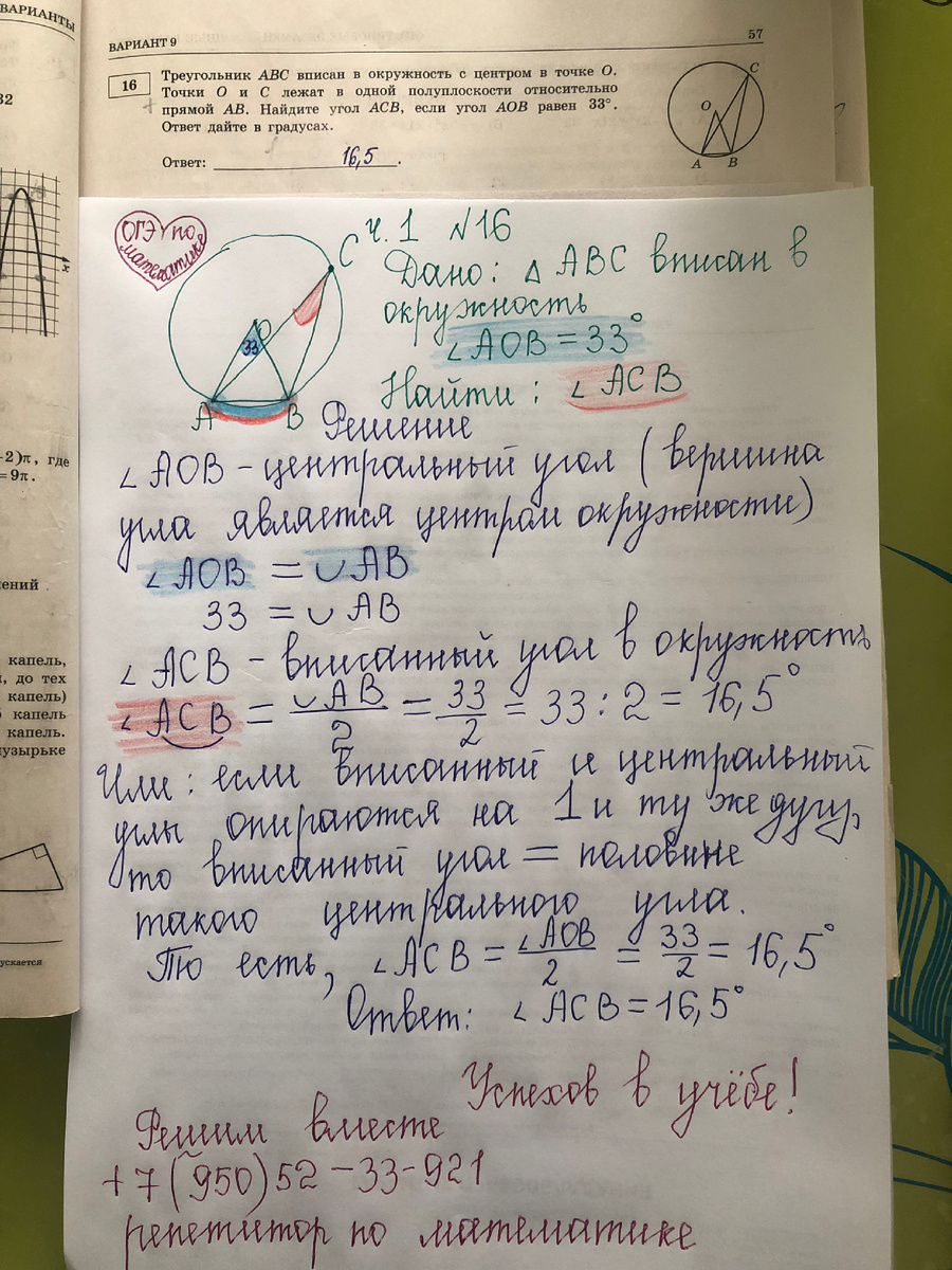ОГЭ по математике: найти угол ACB треугольника, вписанного в окружность (ч. 1 номер 16)