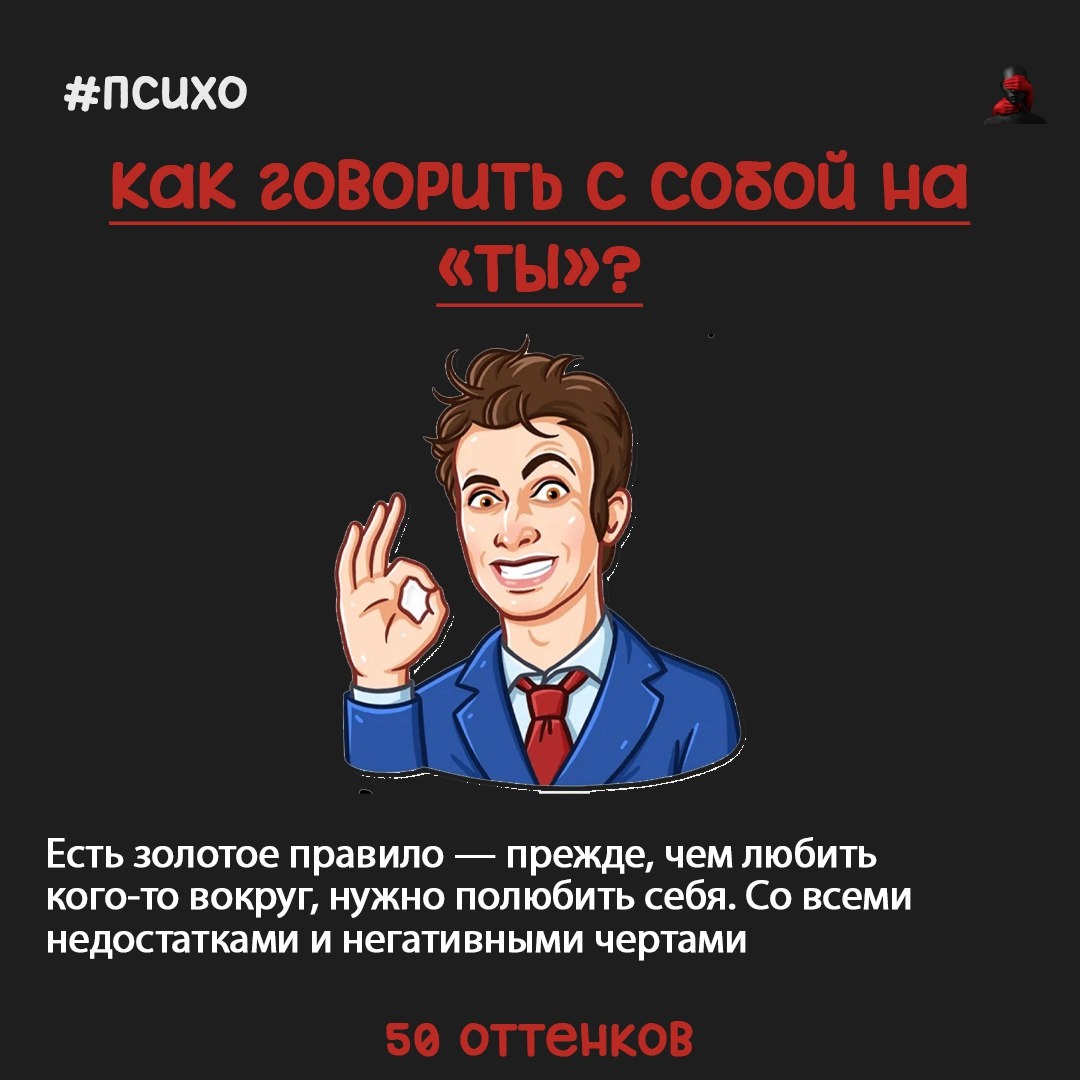 Как говорить с собой на «ты»? Есть золотое правило — прежде, чем любить кого-то вокруг, нужно полюбить себя. Со всеми недостатками и негативными чертами 📌Вы не сможете без самоуважения и полного принятие своего «я» Стали бы вы злиться на незнакомца с улицы, которому не повезло поскользнуться и упасть в лужу? Тогда почему вы вините себя во всех своих неудачах? В голове не должно быть никаких «я все испортил». Старайтесь делать столько, сколько в ваших силах 📌50 оттенков манипуляций