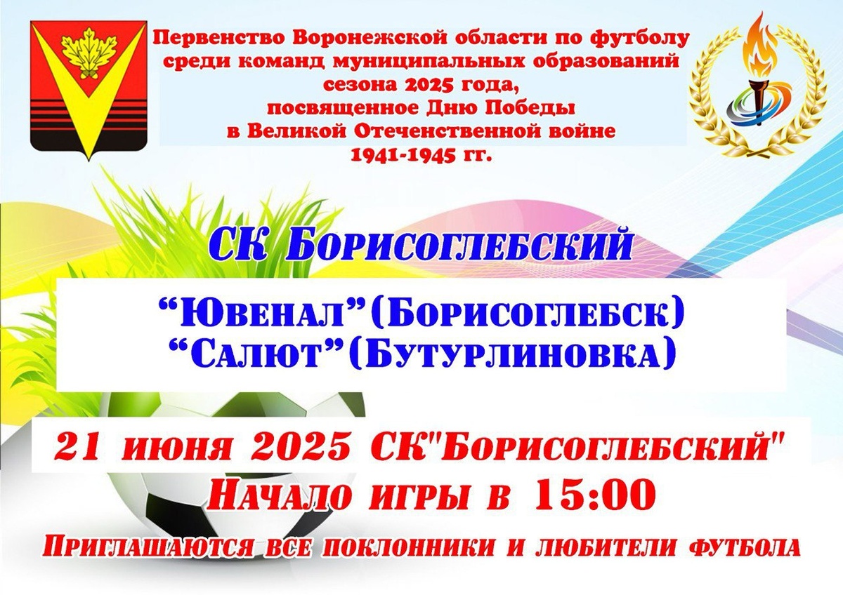 21 июня в 15.00 на стадионе СК «Борисоглебский» встретятся команды «Ювенал» из Борисоглебска и «Салют» из Бутурлиновки.