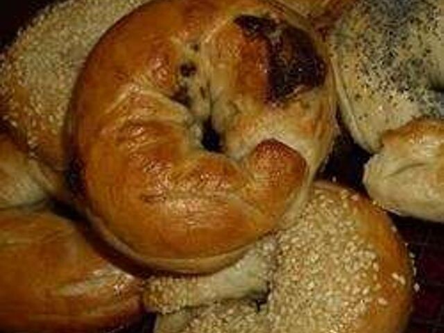 4. Разделить тесто на 12 частей; из 3 частей сформировать гладкие шарики. Проколите в каждом отверстие диаметром 2.50 см. Опустите рогалики в большую сковороду с 2.50 см воды (кипящей) с 1 столовой ложкой сахара и 2 чайными ложками соли в воде. Готовьте на среднем огне 3 минуты, переверните и готовьте 2 минуты; снова переверните и готовьте еще 1 минуту. Слейте воду на полотенце. Повторите для остального теста. Выложить на смазанный жиром лист для печенья.