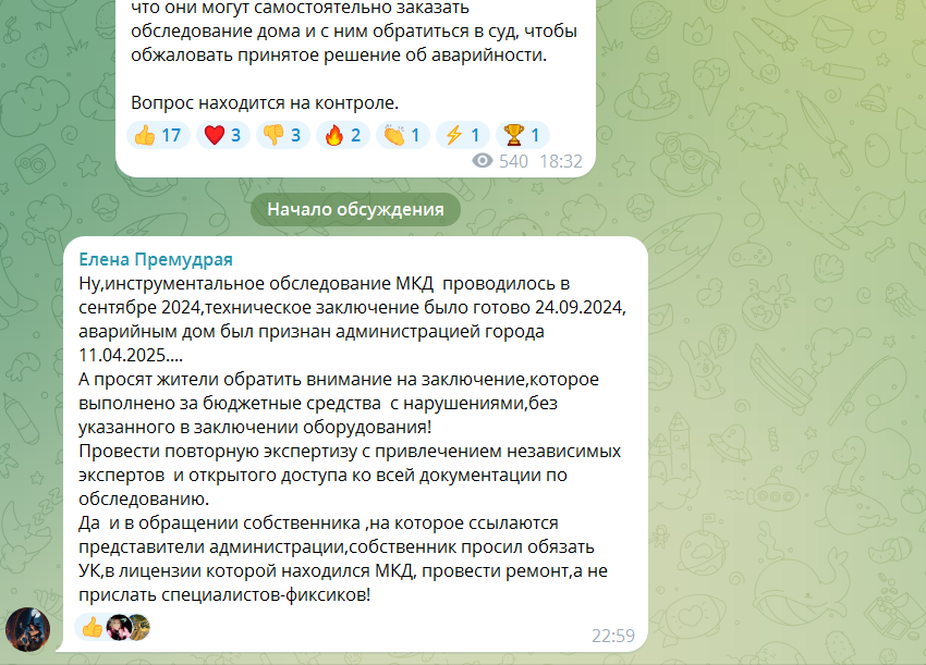 В комментариях под постом замглавы некая Елена Премудрая пишет, что проводимое заключение имеет нарушение, так как в ходе исследования не было использовано указанное в нем оборудование. Жители просят повторную экспертизу с привлечением независимых экспертов и открытого доступа ко всей документации по обследованию.