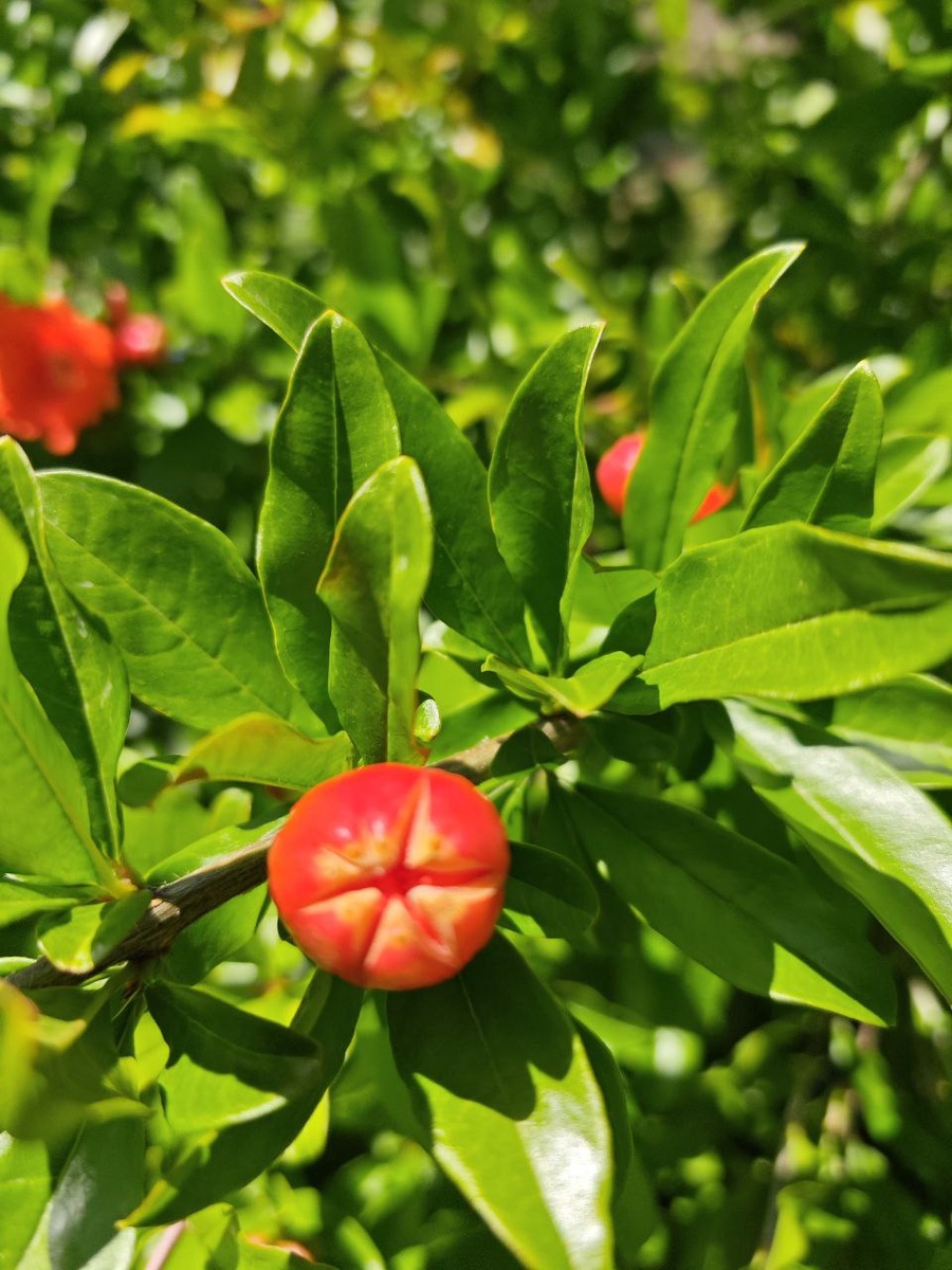 Первый раз за 5 лет у нас зацвел гранат. Нам пришлось два раза его заново сажать, так как он не приживался и засыхал. И вот в этом году двух и трех летние саженцы зацвели. А вы видели как цветет гранатовое дерево? Цветок у него жесткий, как из коры сделанный. У него яркий, насыщенный цвет. Сами цветки небольшого размера.