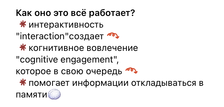 После ковида и миграции всего и всех в онлайн, студенты и даже часть педагогов путают термины ИНТЕРАКТИВНОСТЬ и ГЕЙМИФИКАЦИЯ интерактивность это ➡️НЕ кликание по кнопочкам ➡️НЕ выбор карточек ➡️НЕ собирание пазлов мышкой всё выше упомянутое это геймификация и визуальные эффекты и она не влияет значительно на эффективность занятия и запоминание, как истинная интерактивность Что такое ИНТЕРАКТИВНОСТЬ? это вовлечение, а не клики мышкой "interaction" это чистое взаимодействие в нашем случае с педагогом, которое как раз таки крайне влияет на запоминание, усваивание информации и её понимание Да, даже если оно без всяких кликабельных, геймерских приблуд За счет чего мы лучше запоминаем/понимаем или включаем и усиливаем наше когнитивное вовлечение? все упражнения "на подумать" ака deep processing tasks: ✅дебаты и аргументы, ✅совместный поиск ответа, ✅обмен мнениями, ✅подтверждение личной позиции Важнее то КАКОЕ задание на уроке по английскому студенты выполняют, а не то в каком стиле, визуал