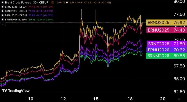 Что напрягает в ценах на нефть Даже на реализацию самого негативного сценария войны на Ближнем Востоке, во фьючерсах на Brent продолжается и даже расширяется бэквордация (чем дальше дата поставки, тем контракт дешевле), а контракты с поставкой через год всё ещё ниже $70 за баррель, пишет НЕБАФЕТТ Рынок пока считает, что война Израиля с Ираном создает лишь угрозу перебоев для ближайших поставок нефти, без долгосрочных последствий 🤔 https://smart-lab.ru/mobile/topic/1169708