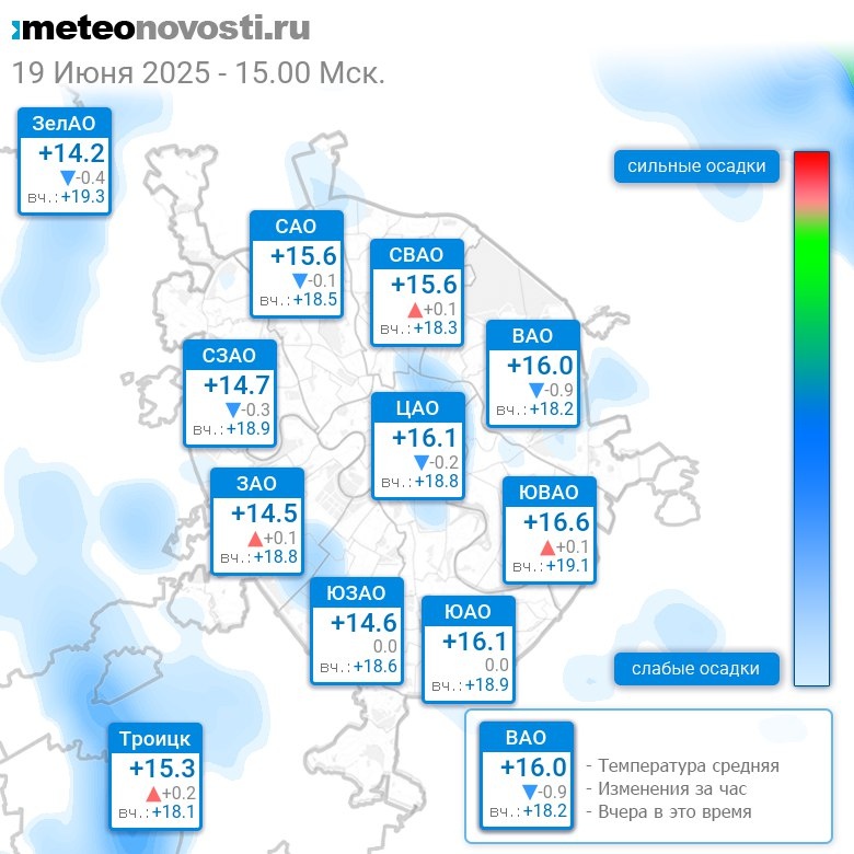 В 15:00 в Москве было от +13.8°C до +16.8°C, средняя температура +15.5°C #погода #Москва #лето #температура #19июня #четверг