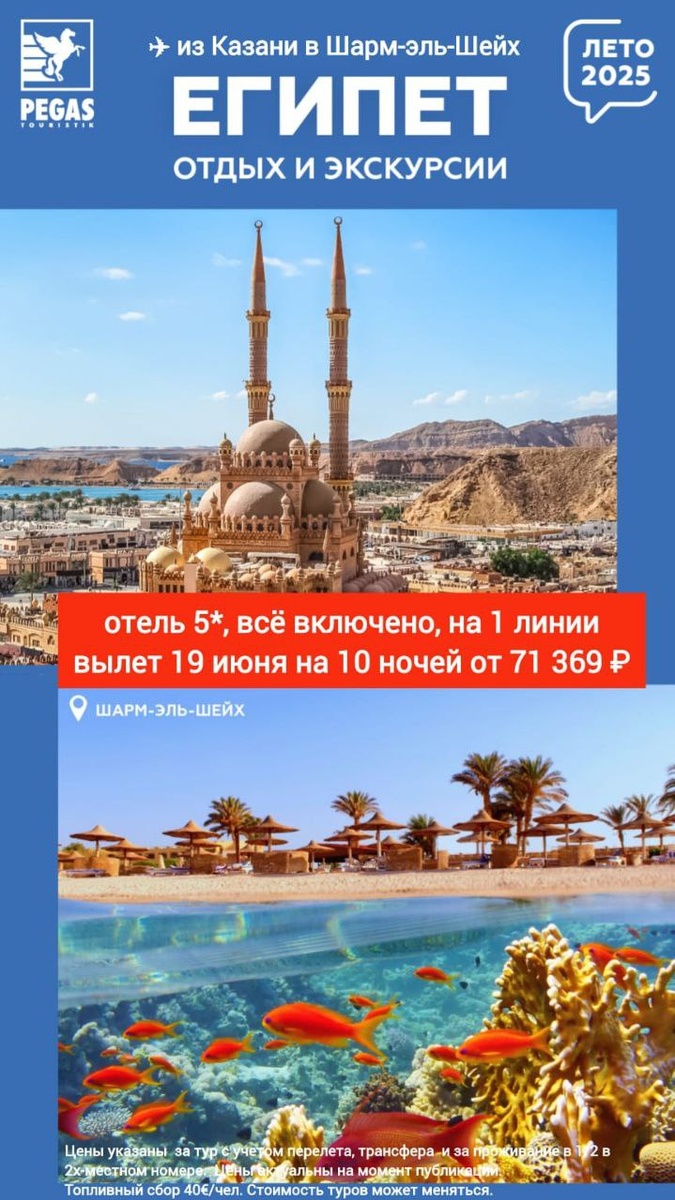 ✅Направление дня!✅ 🔥 Горячее предложение по Египту: * спеццены на туры в Шарм-эль-Шейх! ✈️ Вылет из Казани уже сегодня, 19 июня (20:30 Мск) на 10 ночей: - отели 5* от 71 369 ₽ на одного - отели 4* от 52 980 ₽ на одного - отели 3* от 50 963 ₽ на одного 💳 Цены на туры указаны с учетом перелета, трансфера и проживания в ½ двухместного номера. Без учёта топливного сбора в 40 €/чел. И актуальны на момент публикации. Стоимость туров может меняться.