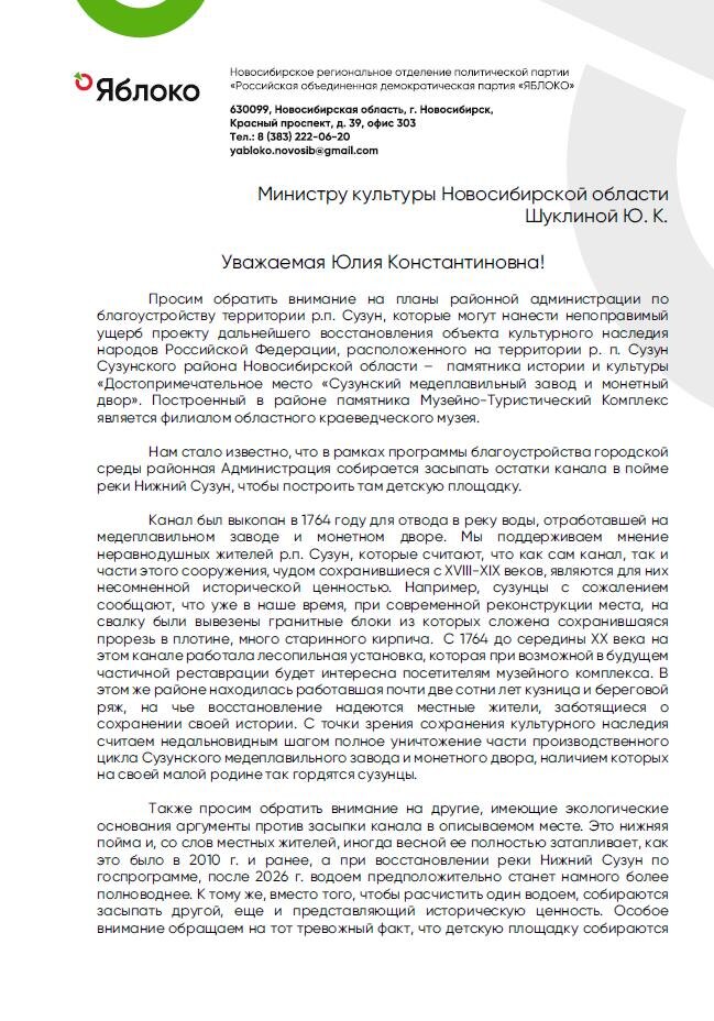 Отправили региональному министру культуры ходатайство о содействии в сохранении памятника истории и культуры регионального значения, расположенного в р.п. Сузун, жители которого попросили Новосибирское Яблоко поддержать их в чаяниях и тревогах за кусочки культурного наследия.