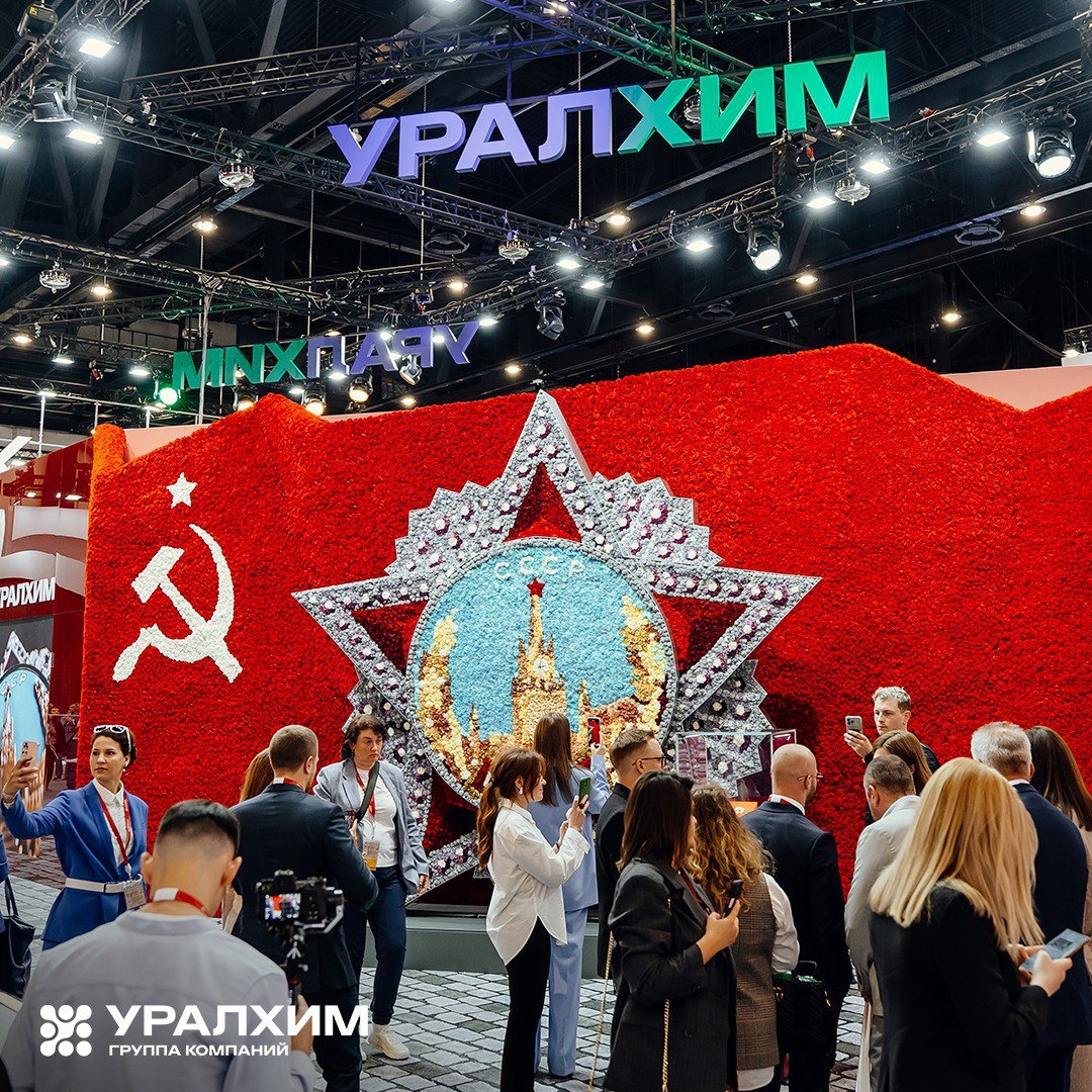 Стенд компании «Уралхим» на главном экономическом форуме России посвятили юбилею Победы. Химический гигант, занимающий лидирующие позиции в производстве минеральных удобрений, верен своим традициям: на Петербургском экономическом форуме компания вновь создала шедевр флористики.