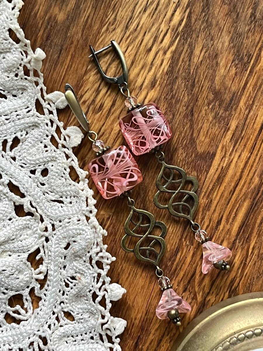 Теряю волю и деньги при виде красивых бусин, сегодня это сложное стекло, как они это делают, волшебники! Персиково розовое, пыльно винтажное, и вот сложились серьги, в античной фурнитуре, с английским замочком.